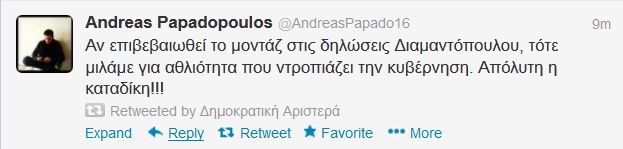 “Αν επιβεβαιωθεί το μοντάζ στις δηλώσεις Διαμαντόπουλου, τότε μιλάμε για αθλιότητα που ντροπιάζει την κυβέρνηση”, twittάρει ο εκπρόσωπος Τύπου της ΔΗΜΑΡ Ανδρέας Παπαδόπουλος.