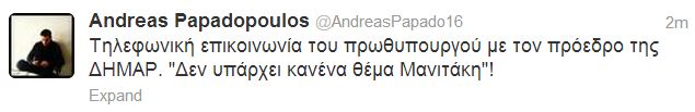 “Τηλεφωνική επικοινωνία του πρωθυπουργού με τον πρόεδρο της ΔΗΜΑΡ. Δεν υπάρχει θέμα Μανιτάκη”!, έγραψε στο twitter ο Ανδρέας Παπαδόπουλος.