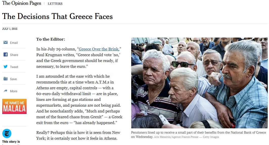 «Στη στήλη του, στις 29 Ιουλίου, “Η Ελλάδα στο χείλος”, ο Πολ Κρούγκμαν γράφει ότι η ‘Ελλάδα πρέπει να ψηφίσει ΟΧΙ και η ελληνική κυβέρνηση θα πρέπει να είναι έτοιμη αν είναι αναγκαίο ακόμα και να φύγει από το ευρώ’