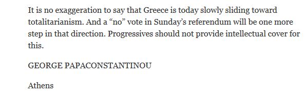 Δεν είναι υπερβολή να πούμε ότι η Ελλάδα σήμερα, ολισθαίνει σιγά σιγά προς έναν ολοκληρωτισμό. Και ένα ΟΧΙ στο δημοψήφισμα της Κυριακής, θα αποτελεί ένα ακόμα βήμα προς αυτήν την κατεύθυνση. Οι προοδευτικοί δε θα πρέπει να παρέχουν πνευματική κάλυψη σε αυτό».