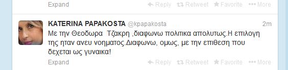 Πριν από λίγο με σχόλιό της στο Twitter η Κατερίνα Παπακώστα εξέφρασε την διαφωνία της για την «επίθεση που δέχεται η Θεοδώρα Τζάκρη ως γυναίκα».