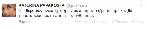 “Στο θέμα των πλειστηριασμών,με συμφωνία ή μη της τρόικας,θα προστατεύσουμε τα σπίτια των ανθρώπων” έγραψε η κυρία Παπακώστα στο Twitter.