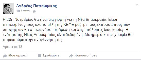 Την κατάσταση στο εσωτερικό της Νέας Δημοκρατίας και τις εκλογές στις 22 Νοεμβρίου, για την ηγεσία του κόμματος, σχολίασε ο Ανδρέας Παπαμιμίκος με ανάρτηση του στο Facebook, επισημαίνοντας ότι η ενότητα στη Νέα Δημοκρατία, είναι δεδομένη. Συγκεκριμένα, ο κ. Παπαμιμίκος έγραψε: