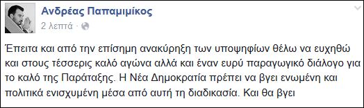 Ο Ανδρέας Παπαμιμίκος έστειλε μέσω της προσωπικής του σελίδας στο Facebook το μήνυμά του μετά την επίσημη ανακήρυξη των υποψηφίων για την προεδρία της ΝΔ.