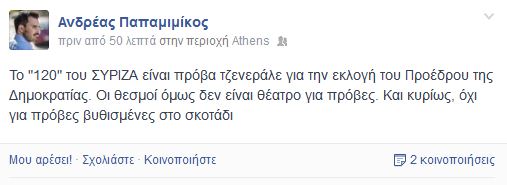 Μετά τον υπουργό Επικρατείας και ο γραμματέας της ΝΔ Ανδρέας Παπαμιμίκος εξαπολύει επίθεση στον Αλέξη Τσίπρα με αφορμή την πρόταση του προέδρου του ΣΥΡΙΖΑ για δημοψήφισμα για τη ΔΕΗ.“Το “120” του ΣΥΡΙΖΑ είναι πρόβα τζενεράλε για την εκλογή του Προέδρου της Δημοκρατίας. Οι θεσμοί όμως δεν είναι θέατρο για πρόβες. Και κυρίως, όχι για πρόβες βυθισμένες στο σκοτάδι ” έγραψε ο κ. Παπαμιμίκος στο Facebook.