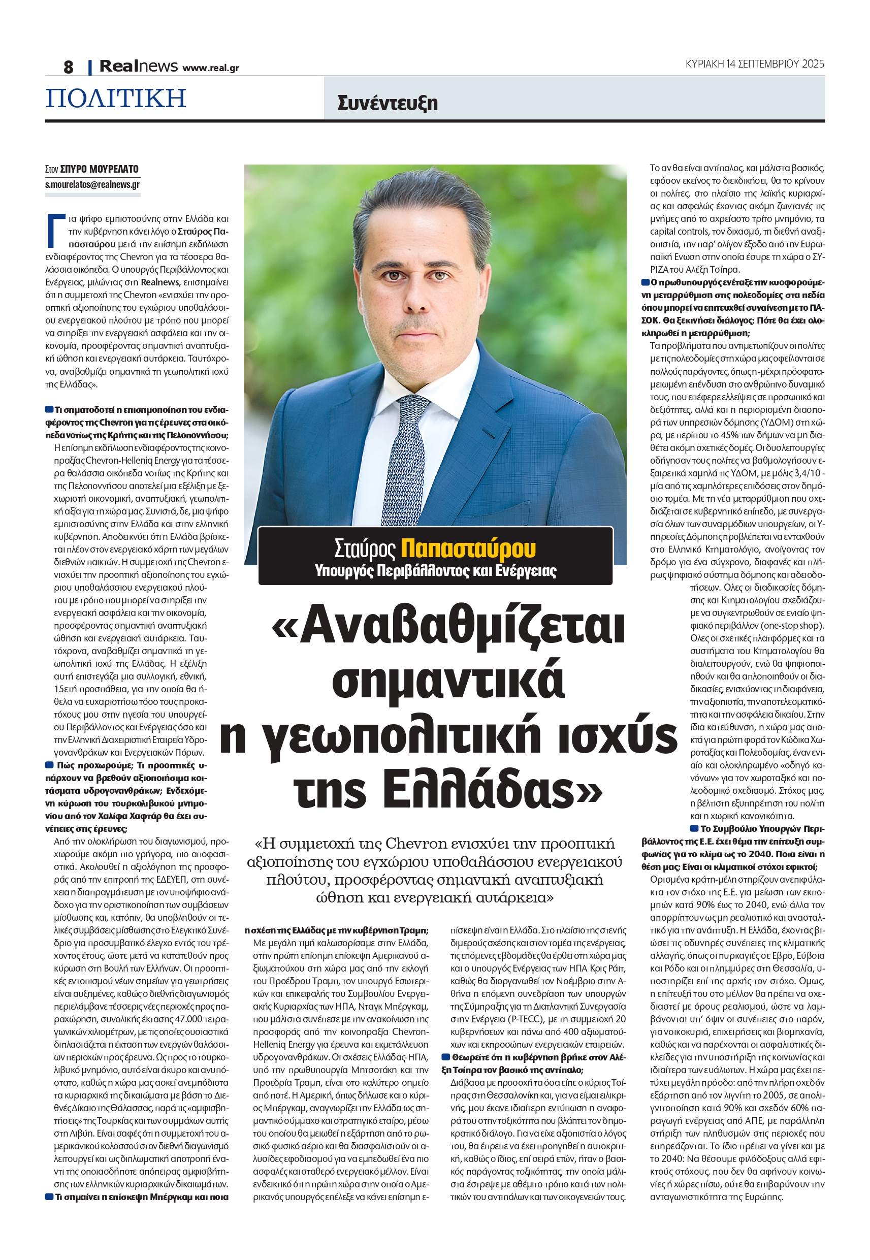 Ο υπουργός Περιβάλλοντος και Ενέργειας, μιλώντας στη Realnews, επισημαίνει ότι η συμμετοχή της Chevron «ενισχύει την προοπτική αξιοποίησης του εγχώριου υποθαλάσσιου ενεργειακού πλούτου με τρόπο που μπορεί να στηρίξει την ενεργειακή ασφάλεια και την οικονομία, προσφέροντας σημαντική αναπτυξιακή ώθηση και ενεργειακή αυτάρκεια. Ταυτόχρονα, αναβαθμίζει σημαντικά τη γεωπολιτική ισχύ της Ελλάδας».