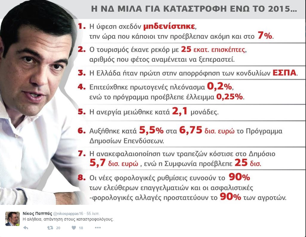 Με ένα γράφημα που ανέβασε στον προσωπικό του λογαριασμό στο Twitter, ο υπουργός Επικρατείας Νίκος Παππάς, παρουσιάζει 8 σημεία σχετικά με την ελληνική οικονομία, ενώ παράλληλα έγραψε: “απάντηση στους καταστροφολόγους.