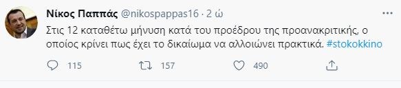 Νωρίτερα, ο Νίκος Παππάς είχε γράψει στο Twitter:”Στις 12 καταθέτω μήνυση κατά του προέδρου της προανακριτικής, ο οποίος κρίνει πως έχει το δικαίωμα να αλλοιώνει πρακτικά” έγραψε ο βουλευτής του ΣΥΡΙΖΑ στο twitter.