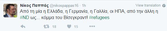 “Κόμμα του Βίσεγκραντ” χαρακτήρισε τη ΝΔ μέσω του λογαριασμού του στο twitter o υπουργός επικρατείας, Νίκος Παππάς αναφερόμενος στο προσφυγικό.
