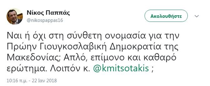 “Ναι ή όχι στη σύνθετη ονομασία για την Πρώην Γιουγκοσλαβική Δημοκρατία της Μακεδονίας; Απλό, επίμονο και καθαρό ερώτημα. Λοιπόν κ. @kmitsotakis ; ”