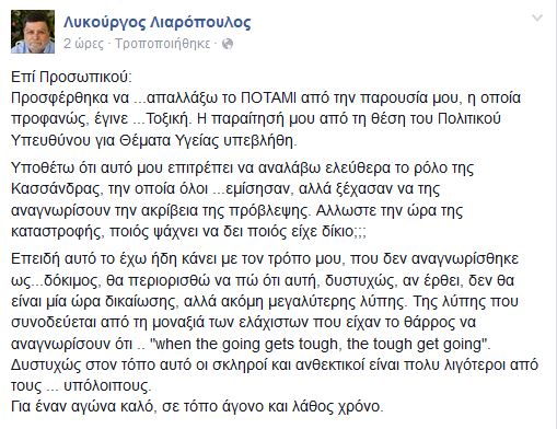 «Το Ποτάμι έκανε δεκτή την παραίτηση του Λυκούργου Λιαρόπουλου από τη θέση του υπεύθυνου Υγείας. Ο Λυκούργος Λιαρόπουλος παραιτήθηκε αποδεχόμενος την ευθύνη του για άστοχες αναρτήσεις στα κοινωνικά δίκτυα, αναρτήσεις οι οποίες απέχουν από τον πολιτικό πολιτισμό του Κινήματος. Η οξύτητα αυτές τις κρίσιμες για την χώρα στιγμές, είναι αχρείαστη. Άλλωστε όπως φαίνεται και από τις επίσημες ανακοινώσεις του, το Ποτάμι, θέλοντας να συμβάλει στην επίλυση των πολλών προβλημάτων της χώρας, έχει υιοθετήσει τον ρόλο της υπεύθυνης και εποικοδομητικής αντιπολίτευσης».