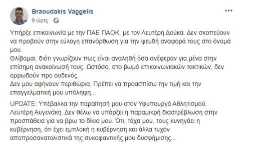 Σε ανάρτηση του στον προσωπικό του λογαριασμό στο Facebook ο κ. Μπραουδάκης έγραψε: “Υπήρξε επικοινωνία με την ΠΑΕ ΠΑΟΚ, με τον Λευτέρη Δούκα. Δεν σκοπεύουν να προβούν στην εύλογη επανόρθωση για την ψευδή αναφορά τους στο όνομά μου. Θλίβομαι, διότι γνωρίζουν πως είναι αναληθή όσα ανέφεραν για μένα στην επίσημη ανακοίνωσή τους. Ωστόσο, στο βωμό επικοινωνιακών τακτικών, δεν ορρωδούν προ ουδενός. Δεν μου αφήνουν περιθώρια. Πρέπει να προασπίσω την τιμή και την επαγγελματική μου υπόληψη…