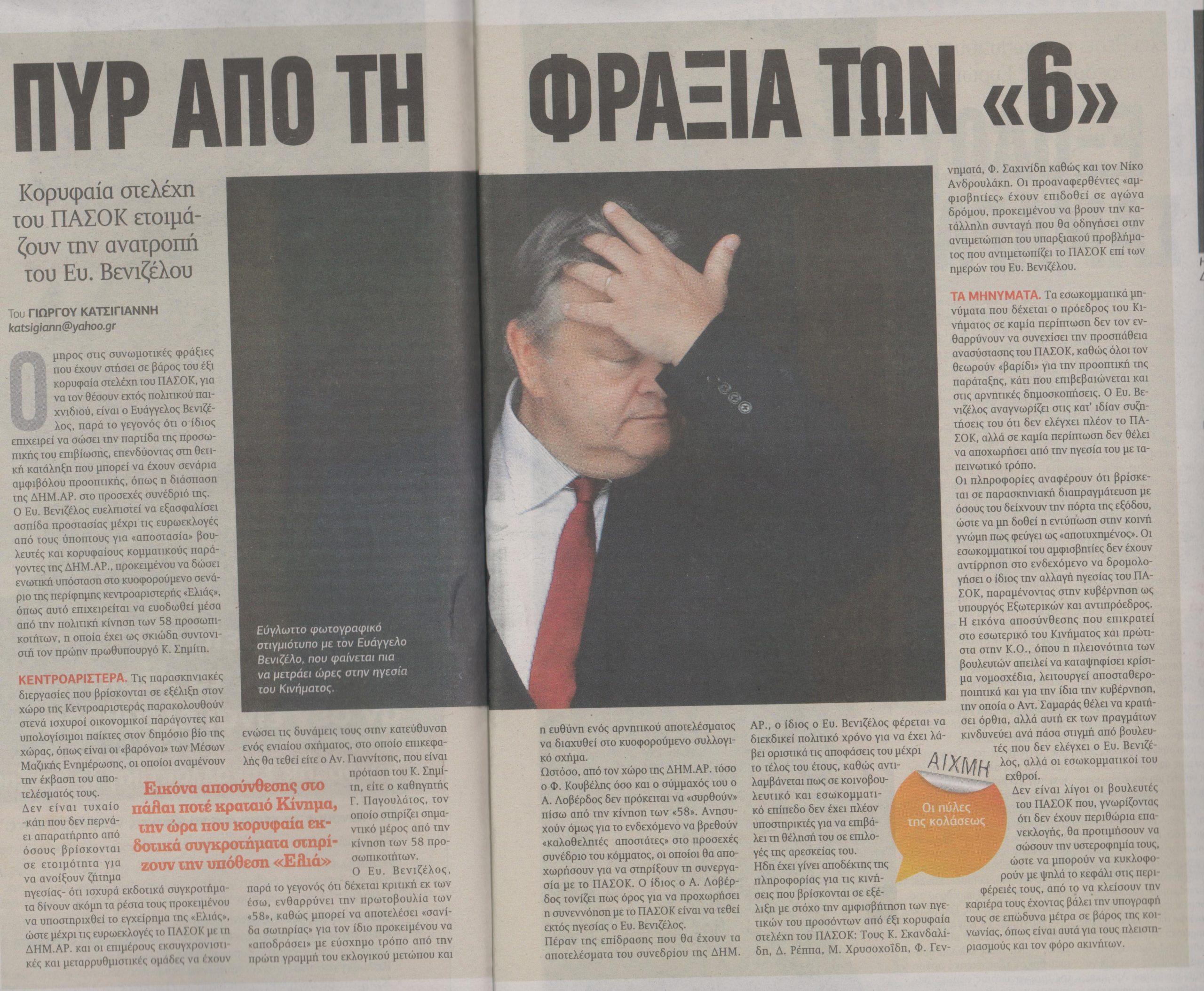 Κορυφαία στελέχη του ΠΑΣΟΚ ετοιμάζουν την ανατροπή του Ευ. Βενιζέλου, σύμφωνα με το ρεπορτάζ της εφημερίδας «Παραπολιτικά».
