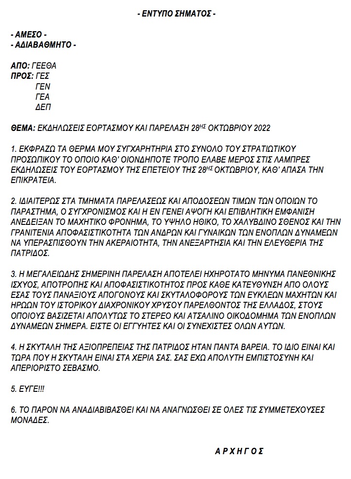 «Εκφράζω τα θερμά μου συγχαρητήρια στο σύνολο του Στρατιωτικού Προσωπικού το οποίο καθ’ οιονδήποτε τρόπο έλαβε μέρος στις λαμπρές εκδηλώσεις του εορτασμού της Επετείου της 28ης Οκτωβρίου, καθ’ άπασα την Επικράτεια.