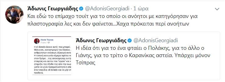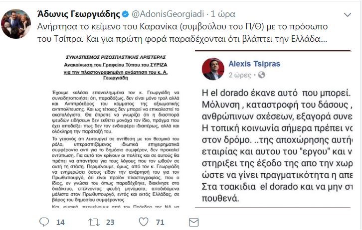 «Έχουμε καλέσει επανειλημμένα τον κ. Γεωργιάδη να συνειδητοποιήσει ότι, παραδόξως, δεν είναι μόνο τρολ αλλά και Αντιπρόεδρος του κόμματος της αξιωματικής αντιπολίτευσης. Και ως τέτοιος δεν μπορεί να επικαλεστεί το ακαταλόγιστο. Θα έπρεπε να γνωρίζει ότι η διασπορά ψευδών ειδήσεων δεν εκθέτει μονάχα τον ίδιο, πράγμα που έχει αποδείξει πως δεν τον ενδιαφέρει ιδιαιτέρως, αλλά και ολόκληρη την παράταξή του», αναφέρει σε ανακοίνωσή του ο ΣΥΡΙΖΑ, όσον αφορά ανάρτηση του Άδωνι Γεωργιάδη στον προσωπικό του λογαριασμό στο twitter. Ο αντιπρόεδρος της ΝΔ, παρουσίασε τον πρωθυπουργό να ισχυρίζεται ότι «η Eldorado πρέπει να πάει στα… τσακίδια», κάτι το οποίο είχε αναφέρει μέσω facebook ο Νίκος Καρανίκας.«Το γεγονός ότι λειτουργεί σε αντίθεση με τον θεσμικό του ρόλο, υπερασπιζόμενος ιδιωτικά επιχειρηματικά συμφέροντα αντί για το δημόσιο συμφέρον, δεν προκαλεί εντύπωση. Για αυτό τον κρίνουν οι πολίτες και σε αυτούς θα πρέπει να απαντήσει για τους λόγους που τον ωθούν σε αυτή τη στάση. Περιμένουμε, όμως, από τον κ. Γεωργιάδη να ενημερώσει όσους είδαν την ανάρτησή του για τον Πρωθυπουργό, ότι είναι προϊόν πλαστογραφίας, που ο ίδιος, εν γνώσει του όπως παραδέχθηκε, διακίνησε στο διαδίκτυο, στέλνοντας ψευδή μηνύματα, αποδιδόμενα μάλιστα στον Πρωθυπουργό, εντός και εκτός Ελλάδας, σε βάρος του δημοσίου συμφέροντος», επισημαίνει ο ΣΥΡΙΖΑ.«Και, φυσικά, περιμένουμε από τον Πρόεδρο της ΝΔ να πράξει τα δέοντα. Διατηρώντας τον στη θέση του Αντιπροέδρου της ΝΔ θα επικροτήσει την πλαστογραφία», τονίζει κλείνοντας η ανακοίνωση.