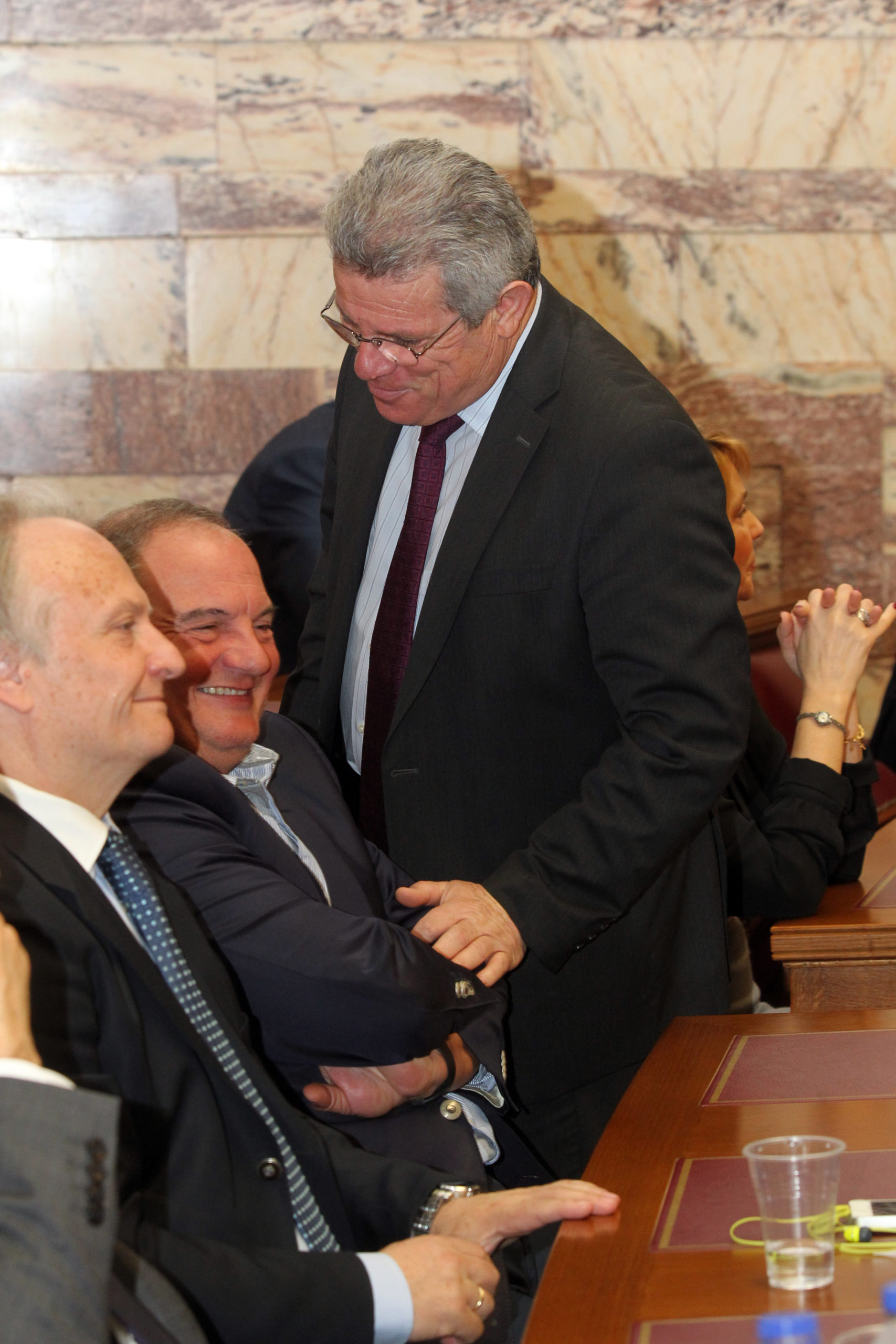 Παρόντες στα έδρανα της αίθουσας Γερουσίας της Βουλής για να παρακολουθήσουν την ομιλία του Κυριάκου Μητσοτάκη στην Κοινοβουλευτική Ομάδα της ΝΔ, ήταν οι πρώην πρωθυπουργοί Κώστας Καραμανλής και Αντώνης Σαμαράς.