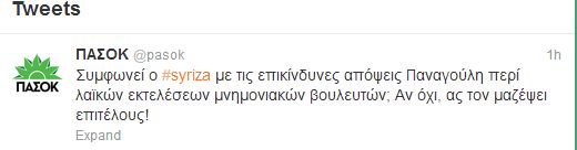 “Συμφωνεί ο ΣΥΡΙΖΑ με τις επικίνδυνες απόψεις Παναγούλη περί λαϊκών εκτελέσεων μνημονιακών βουλευτών; Αν όχι, ας τον μαζέψει επιτέλους!”, ήταν το σχόλιο στο Twitter του ΠΑΣΟΚ.