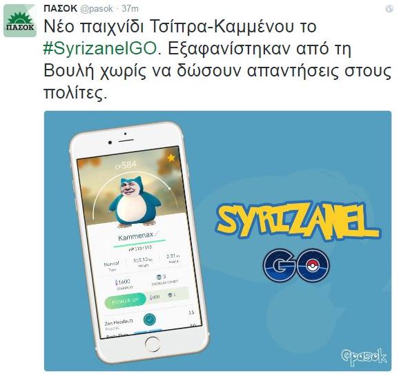 Εμπνευσμένη από το εικονικό παιχνίδι Pokemon Go που έχει προκαλέσει παγκόσμια υστερία ήταν η ανάρτηση του ΠΑΣΟΚ στον επίσημο λογαριασμό του στο twitter.