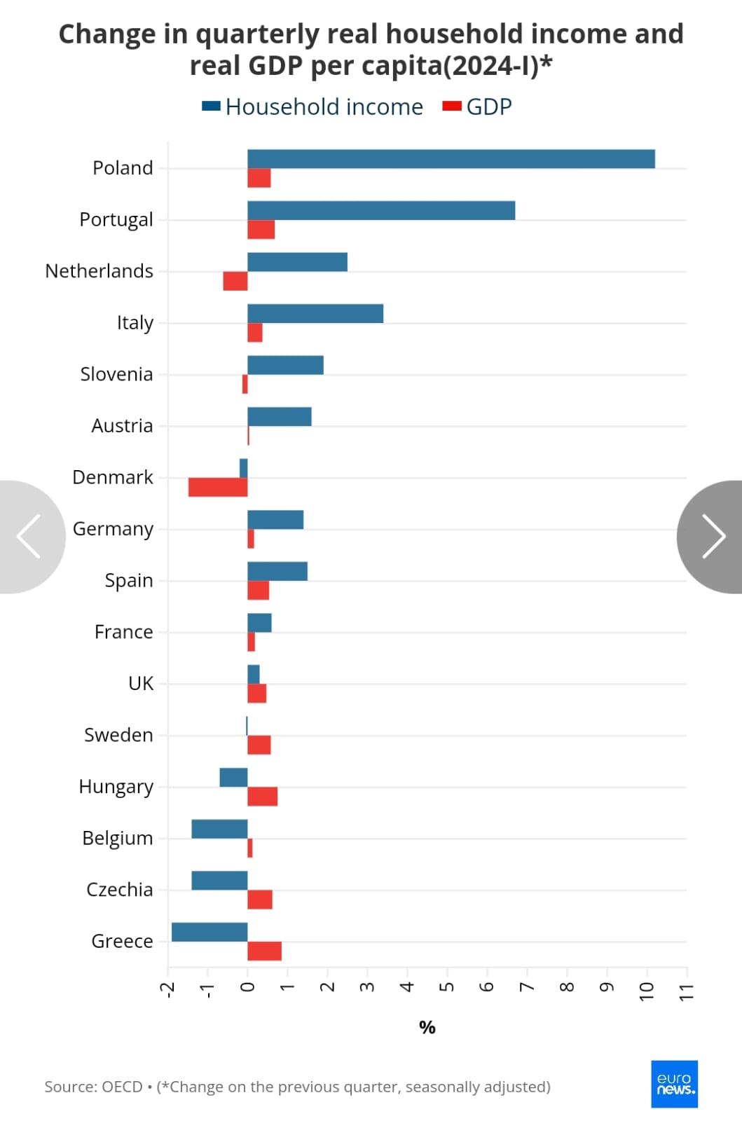 Β) Τα οφέλη της ανάπτυξης δεν φτάνουν στην κοινωνία. Σύμφωνα με τον ΟΟΣΑ, για το πρώτο τρίμηνο του 2024, τα στοιχεία δείχνουν ότι ενώ το κατά κεφαλήν ΑΕΠ στην Ελλάδα αυξήθηκε σχεδόν 0,9% σε σύγκριση με το 4ο τρίμηνο του 2023, το πραγματικό εισόδημα των νοικοκυριών μειώθηκε κατά 1,9%, σημειώνοντας τη μεγαλύτερη μείωση. Η Ελλάδα μάλιστα αποτελεί θλιβερή εξαίρεση μεταξύ των μελών του ΟΟΣΑ, όπου η μέση αύξηση του πραγματικού εισοδήματος των νοικοκυριών (0,9%) είναι πολλαπλάσια της αύξησης του κατά κεφαλήν ΑΕΠ (0,3%). Ακόμα και σε χώρες όπως η Ολλανδία, όπου το πραγματικό ΑΕΠ μειώθηκε το πρώτο τρίμηνο του έτους, το πραγματικό εισόδημα των νοικοκυριών αυξήθηκε.