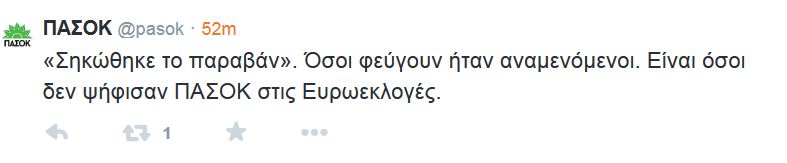 Αυτό ήταν το σχόλιο του ΠΑΣΟΚ στο Twitter σχετικά με τα στελέχη που παραιτούνται για να συμμετάσχουν στο κόμμα που ιδρύει ο Γιώργος Παπανδρέου.