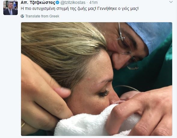 “Η πιο ευτυχισμένη στιγμή της ζωής μας! Γεννήθηκε ο γιος μας!” έγραψε ο κ. Τζιτζικώστας ανεβάζοντας και μια φωτογραφία με τη σύζυγό του και τον νεογέννητο γιο τους.