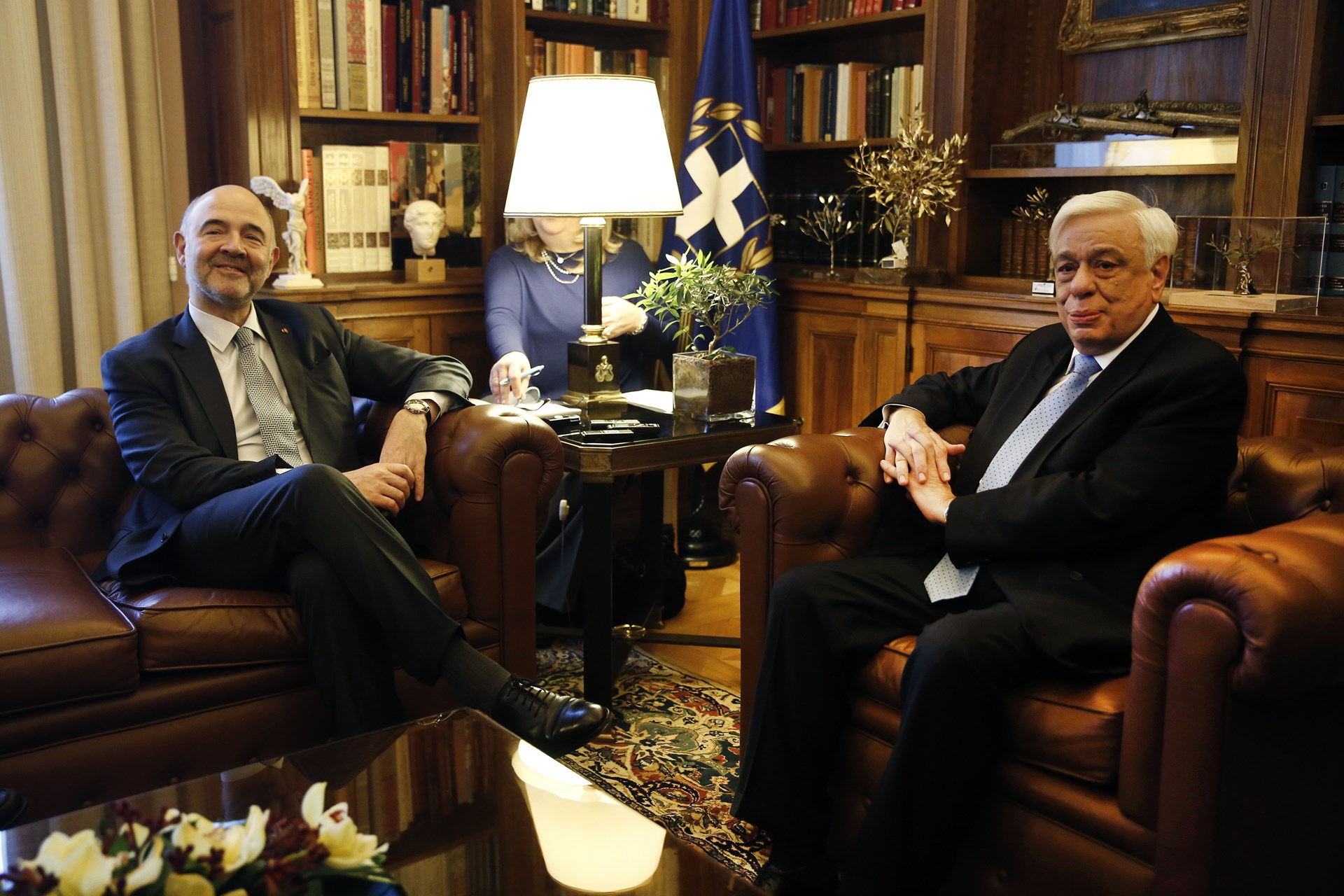 Ο Πρόεδρος της Δημοκρατίας, Προκόπης Παυλόπουλος, καλωσόρισε για άλλη μια φορά στο Προεδρικό Μέγαρο τον Επίτροπο Οικονομικών Υποθέσεων της Ευρωπαϊκής Ένωσης, Πιερ Μοσκοβισί, «τώρα που βρισκόμαστε» όπως είπε «στο τέλος του προγράμματος για την Ελλάδα». Παράλληλα, τον ευχαρίστησε για τη συμβολή του σε αυτό, καθώς επίσης και για τη συμβολή του προκειμένου να ξεκινήσει η διαδικασία ελάφρυνσης του χρέους, που, όπως επισήμανε, αποτελεί υποχρέωση των εταίρων μας.