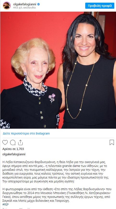 Η Όλγα Κεφαλογιάννη αποχαιρέτησε την αγαπημένη της θεία της με μία συγκινητική ανάρτηση στον προσωπικό της λογαριασμό στο Instagram.