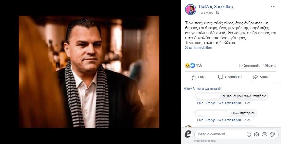 Ο Παύλος Χρηστίδης σε ανάρτησή του στο facebook αποχαιρέτισε τον καλό του φίλο: “Τι να πεις; ένας καλός φίλος, ένας άνθρωπος, με θάρρος και άποψη, ένας μαχητής της παράταξης έφυγε πολύ πολύ νωρίς. Θα λείψεις σε όλους μας και στην Αργολίδα που τόσο αγάπησες.