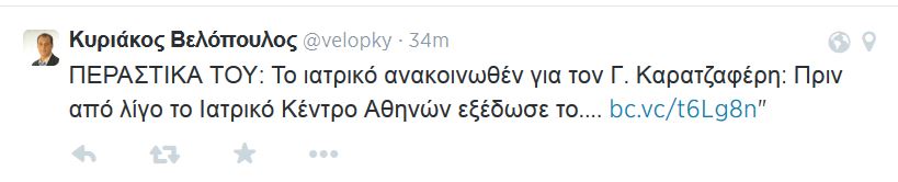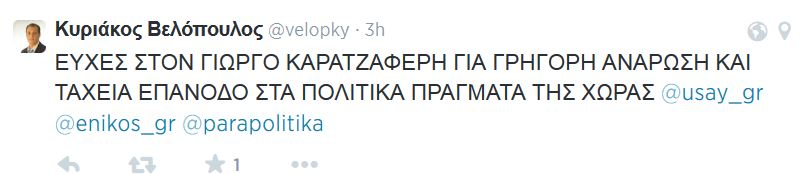 “Ευχές στον Γιώργο Καρατζαφέρη για γρήγορη ανάρρωση και ταχεία επάνοδο στα πολιτικά πράγματα της χώρας”, έγραψε στο Twitter ο κ. Βελόπουλος, πρώην βουλευτής του ΛΑΟΣ.