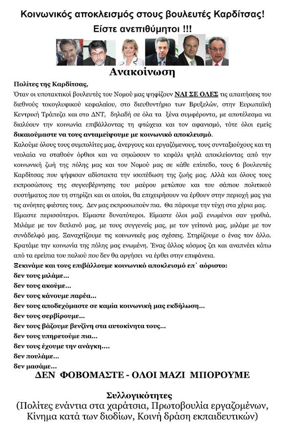 Με φυλλάδια που μοίρασαν σήμερα οι πολίτες στην Καρδίτσα, προτείνουν κοινωνικό αποκλεισμό για τους βουλευτές του Νομού τους που ψήφισαν το μνημόνιο. Διαβάστε την ανακοίνωση.