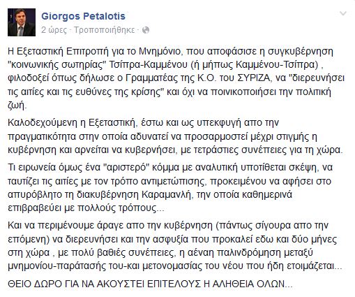 Την απόφαση του ΣΥΡΙΖΑ να καταθέσει πρόταση σύστασης εξεταστικής επιτροπής για τα μνημόνια, σχολίασε μέσω του προσωπικού του λογαριασμού στο Facebook, ο εκπρόσωπος Τύπου του Κινήματος Δημοκρατών Σοσιαλιστών, Γιώργος Πεταλωτής, χαρακτηρίζοντας την Εξεταστική «καλοδεχούμενη». Αναλυτικά έγραψε: