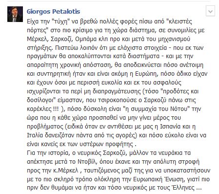 Για την ιστορία, ο νευρικός Σαρκοζύ, μάλλον τα νευράκια τα απέκτησε μετά το Ντοβίλ, όπου έκανε και την απόλυτη στροφή προς την κ.Μέρκελ , ταυτιζόμενος μαζί της για να υποκαταστήσουν με το πιο σκληρό τρόπο ολόκληρη την Ευρωπαική Ένωση, γιατί πιο πριν δεν θυμάμαι να ήταν και τόσο νευρικός με τους Έλληνες …», έγραψε ο κ. Πεταλωτής στο Facebook.