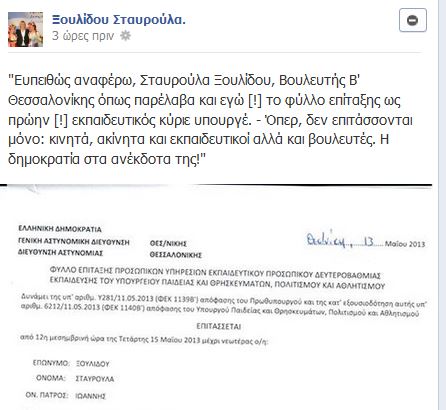 ΦΩΤΟ-Επιστράτευσαν βουλευτή!Ακόμα η βουλευτής των Ανεξάρτητων Ελλήνων Σταυρούλα Ξουλίδου παρέλαβε φύλλο πορείας, στο πλαίσιο της επιστράτευσης των εκπαιδευτικών.”Ευπειθώς αναφέρω, Σταυρούλα Ξουλίδου, Βουλευτής Β’ Θεσσαλονίκης όπως παρέλαβα και εγώ [!] το φύλλο επίταξης ως πρώην [!] εκπαιδευτικός κύριε υπουργέ. – Όπερ, δεν επιτάσσονται μόνο: κινητά, ακίνητα και εκπαιδευτικοί αλλά και βουλευτές. Η δημοκρατία στα ανέκδοτα της!” έγραψε η ίδια η Τομεάρχης Παιδείας των Ανεξάρτητων Ελλήνων στη σελίδα της στο Facebook και ανέβασε το φύλλο πορείας που παρέλαβε.