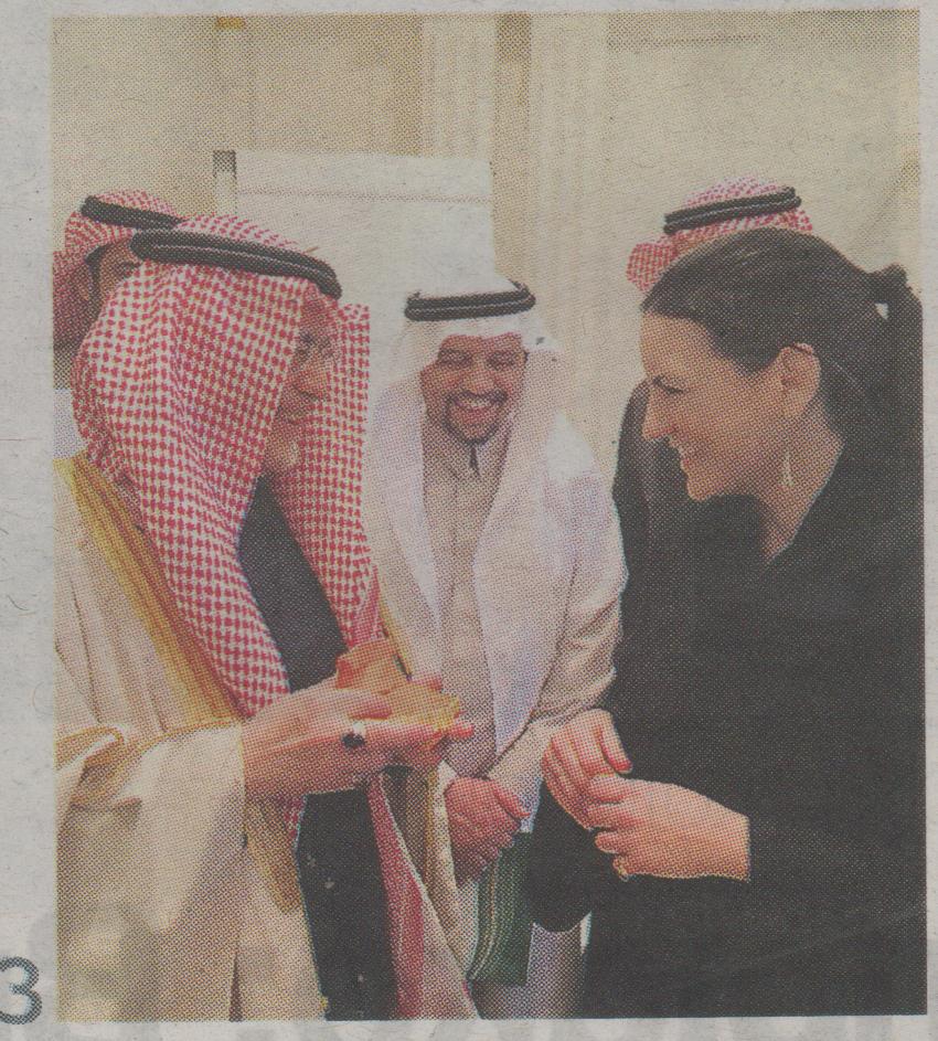 Πάντα ενδεδυμένη με τη μαύρη αμπάγια, απαραίτητο ένδυμα και για την Ευρωπαία που θα θελήσει να επισκεφτεί τη χώρα της Μέσης Ανατολής, παρακολούθησε με τον ομόλογό της και άλλους πρίγκιπες τις τελετές σε διάφορα στάδια του Ριάντ με καμηλοδρομίες, παραδοσιακούς χορούς, κλπ.