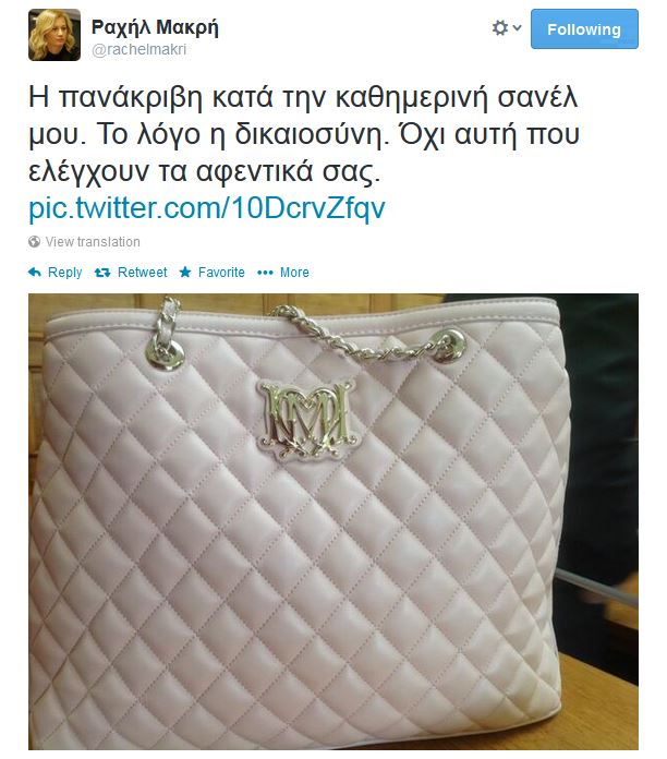 Με μια φωτογραφία της τσάντας της που ανήρτησε στον προσωπικό της λογαριασμό στο twitter, απάντησε η Ραχήλ Μακρή στο δημοσίευμα της εφημερίδας Καθημερινή, που άφηνε αιχμές για την εμφάνιση της βουλευτή των Ανεξάρτητων Ελλήνων.