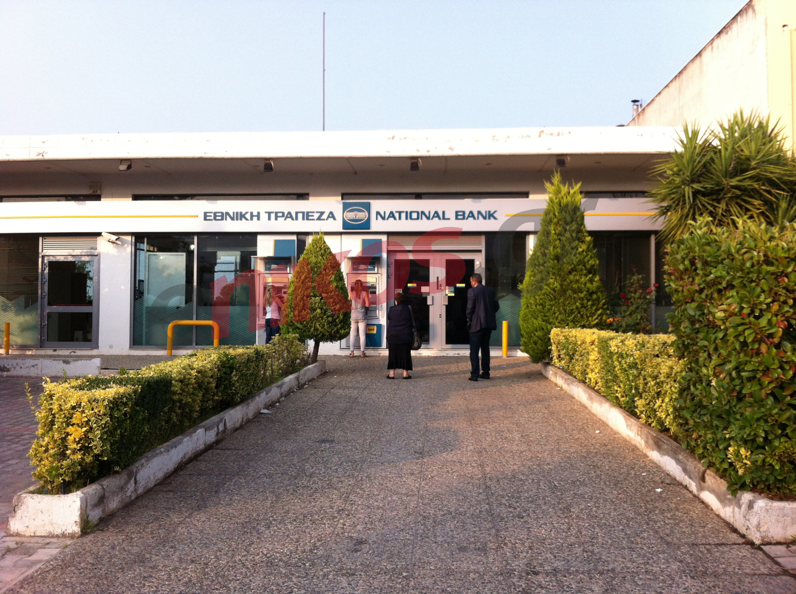 Η Αλέκα Παπαρήγα, περιμένει υπομονετικά τη σειρά της , στην τράπεζα της Νέας Μάκρης για να κάνει ανάληψη.