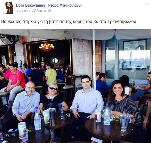 Στη Χίο βρίσκεται η Ντόρα Μπακογιάννη για να παραστεί στη βάφτιση της κόρης του Κώστα Τριαντάφυλλου. Στη φωτογραφία που ανέβασε στη σελίδα της η βουλευτής της Νέας Δημοκρατίας, ποζάρουν η βουλευτής της Νέας Δημοκρατίας Φωτεινή Πιπιλή, ο βουλευτής του ΠΑΣΟΚ και πατέρας της νεοφώτιστης Κώστας Τριαντάφυλλος και ο βουλευτής του ΠΑΣΟΚ Δημήτρης Σαλτούρος, να απολαμβάνουν τον καφέ τους.