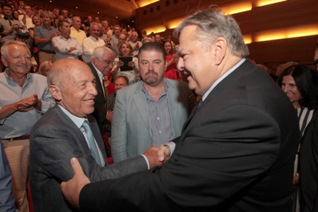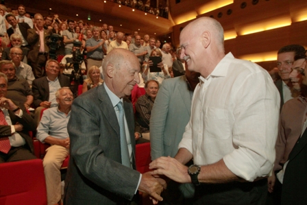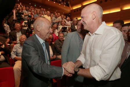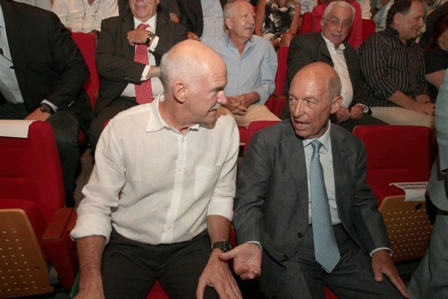 Φιλικό ήταν το κλίμα ανάμεσα στον πρόεδρο του ΠΑΣΟΚ και τον Γιώργο Παπανδρέου που αντάλλαξαν τη χειραψία πριν από την έναρξη του συμποσίου.