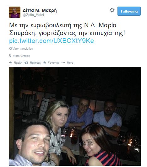 Στην παρέα της και η υφυπουργός Ζέττα Μακρή, η οποία ανέβασε τη φωτογραφία στο twitter της γράφοντας: Με την ευρωβουλευτή της Ν.Δ. Μαρία Σπυράκη, γιορτάζοντας την επιτυχία της!