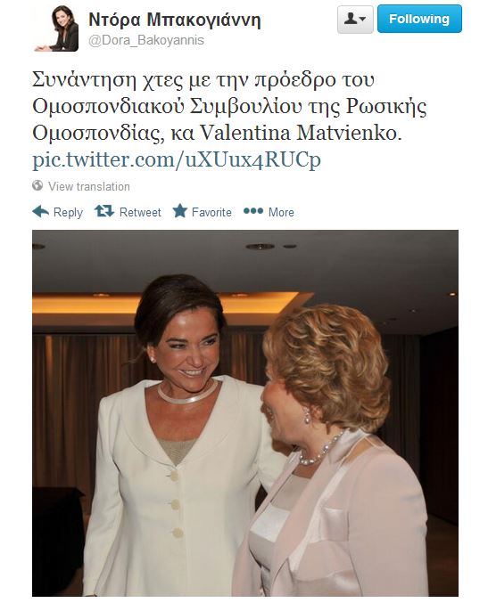 Από τη συνάντηση η κ. Μπακογιάννη ανέβασε στον προσωπικό της λογαριασμό στο twitter, την παρακάτω φωτογραφία, σημειώνοντας: «Συνάντηση χτες με την πρόεδρο του Ομοσπονδιακού Συμβουλίου της Ρωσικής Ομοσπονδίας, κα Valentina Matvienko».
