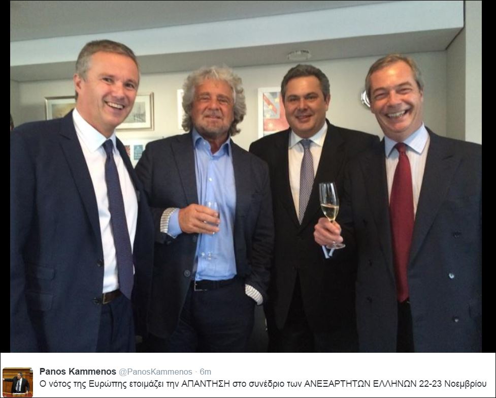 Στις Βρυξέλλες βρίσκεται ο πρόεδρος των Ανεξαρτήτων Ελλήνων, Πάνος Καμμένος. Ο κ. Καμμένος ανέβασε στο twitter φωτογραφίες από την συνάντησή του με τον Πρόεδρο του Κινήματος των Πέντε Αστέρων, Μπέπε Γκρίλο και τον επικεφαλής του αντιευρωπαϊκού κόμματο της Βρετανίας UKIP και ευρωβουλευτή, Νάιτζελ Φάρατζ.