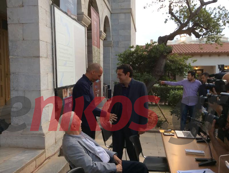 Θερμή χειραψία αντάλλαξαν ο Αλέξης Τσίπρας και ο Γιάννης Βαρουφάκης κατά την παρουσίαση του βιβλίου του γνωστού οικονομολόγου στο Βυζαντινό Μουσείο.