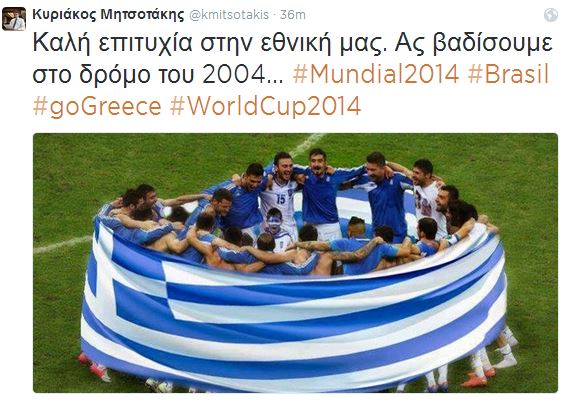 Με ένα μήνυμα στον προσωπικό του λογαριασμό στο twitter ο υπουργός Διοικητικής Μεταρρύθμισης και Ηλεκτρονικής Διακυβέρνησης, Κυριάκος Μητσοτάκης, εύχεται καλή επιτυχία στην εθνική Ελλάδος, με αφορμή την έναρξη του Μουντιάλ σήμερα.