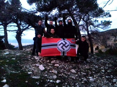 Σε μια από τις φωτογραφίες, είναι και ο Ηλίας Κασιδιάρης, ο οποίος με τη συντροφιά μασκοφόρων μελών της οργάνωσης κρατούν τη ναζιστική σημαία, γιορτάζοντας την έναρξη του θερινού ηλιοστασίου.