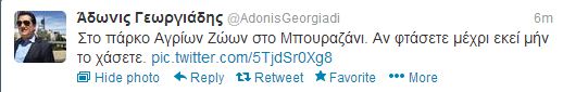 Στο πάρκο άγριων ζώων περνά μερικές ώρες χαλάρωσης ο βουλευτής της Ν.Δ. ‘Αδωνις Γεωργιάδης και μέσω του twitter προτρέπει και όσους τον ακολουθούν να το επισκεφτούν.