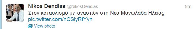 Ο υπουργός Προστασίας του Πολίτη Νίκος Δένδιας “ανέβασε” στο twitter φωτογραφία του από την σημερινή επίσκεψή του στον καταυλισμό μεταναστών στη Μανωλάδα.