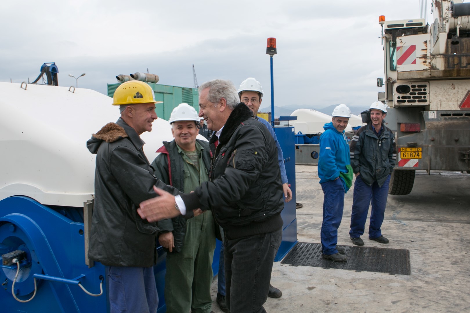 Ο Υπουργός Εθνικής Άμυνας αναφέρθηκε στους εργαζόμενους των Ναυπηγείων Σκαραμαγκά και στα «ελληνικά χέρια που ολοκλήρωσαν την κατασκευή του», όπως χαρακτηριστικά είπε: «Και βέβαια μία ιδιαίτερη αναφορά στους εργαζόμενους στα Ναυπηγεία.