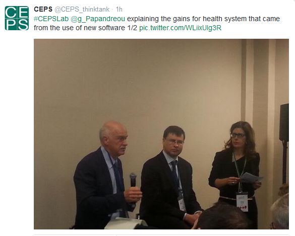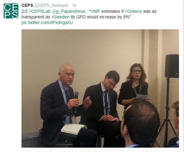 Μπορεί η δήλωσή του και οι αντιδράσεις που αυτή προκάλεσε, να αποτελούν ένα από τα βασικά θέματα της πολιτικής ατζέντας σήμερα, όμως ο πρώην Πρωθυπουργός Γιώργος Παπανδρέου δεν εγκαταλείπει εύκολα τις συνήθειές του.Πριν από λίγο δημοσιεύτηκαν οι φωτογραφίες από την ομιλία του σε think tank των Βρυξελλών.Απαθανατίστηκε να μιλάει στο CEPS, στις Βρυξέλλες που είναι μία από τις κορυφαίες ανεξάρτητες δεξαμενές σκέψης της Ευρωπαϊκής Ένωσης.