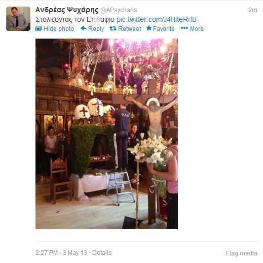 Δείτε τη φωτογραφία που ανέβασε στον προσωπικό του λογαριασμό στο twitter, ο βουλευτής της ΝΔ, Ανδρέας Ψυχάρης, από τον στολισμό του Επιταφίου, χθες το βράδυ.