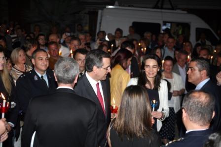 Ο Αντώνης Σαμαράς  ευχήθηκε «Χριστός Ανέστη και Χρόνια Πολλά σε όλους» και αντάλλαξε ευχές με τους πολιτικούς του νομού καθώς και με πάρα πολύ κόσμο.